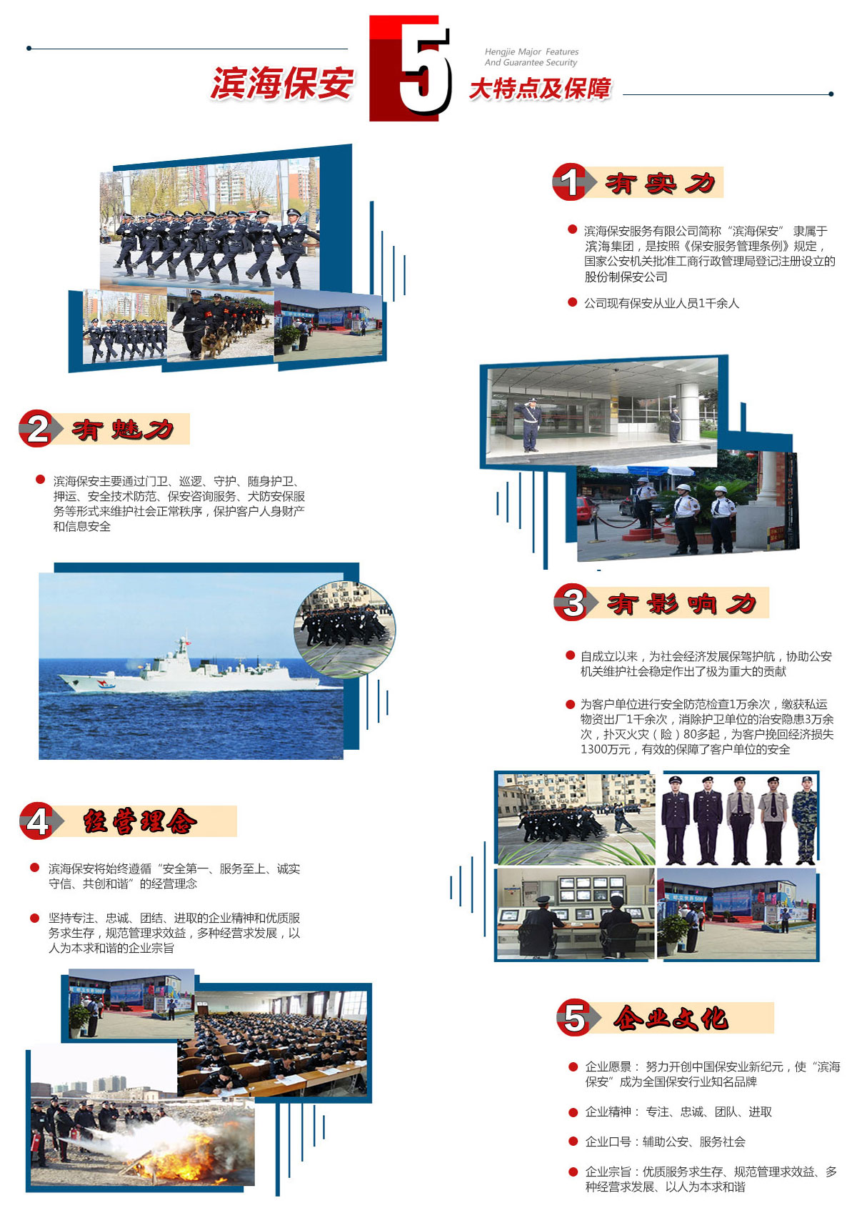 濱海保安主要通過門衛(wèi)、巡邏、守護、隨身護衛(wèi)、押運、安全技術防范、保安咨詢服務、犬防安保服務等形式來維護社會正常秩序,保護客戶人身財產(chǎn)和信息安全。公司現(xiàn)有保安從業(yè)人員1千余人,客戶單位涵蓋黨政機關、企事業(yè)單位、金融機構、高檔寫字樓、賓館飯店、高檔別墅、高等院校、大型商場、建筑行業(yè)等,現(xiàn)有單位100余家。